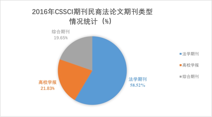 中国人民大学民商事法律科学研究中心对2016年民商事法律科学论文数据统计,是以中国社会科学研究中心2015—2016年公布CSSCI来源期刊包括:法学(21种)、综合性社科期刊(50种)、高校综合性学报(70种),共计141种期刊为范畴。2016年上述CSSCI来源期刊中共有115种期刊发表了民商事法律科学论文,其中法学(21种)CSSCI来源期刊发表民商事法律科学论文数量536篇,超过总量的一半;综合期刊发表200篇,接近总数五分之一。