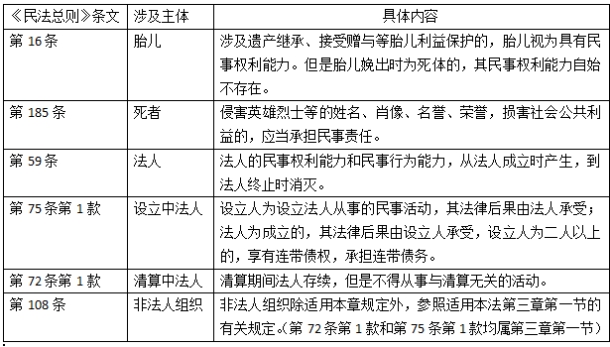 《中华人民共和国民法总则》(以下简称《民法总则》)在“自然人”、“法人”和“民事责任”三章中对胎儿、死者和设立中的法人、清算中的法人都作出了规定,将原来单一的民事权利能力分为完全民事权利能力和部分民事权利能力的复式结构。