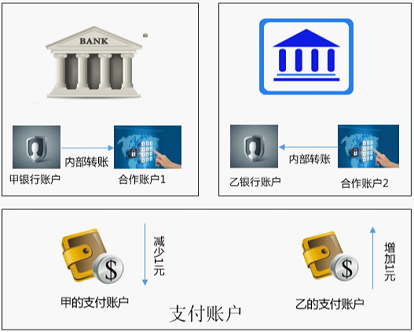 若通过直连模式完成这一支付清算过程:不同的是,甲乙均在某支付机构开设支付账户,那么,支付机构只需要做一件事,即其在A银行的账户中减掉一元,在B银行的账户增加一元,而两位客户的支付账户资金作相应的增加和减少就行了。