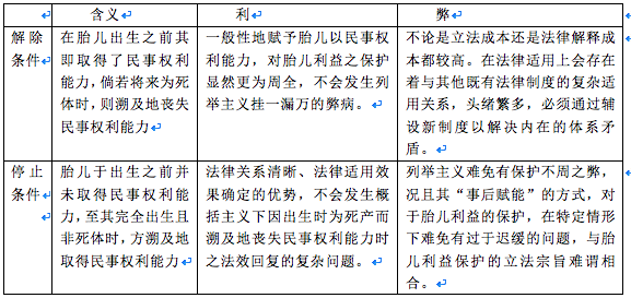 由《民法总则》第16条“但书”规定的表述来看,在解释上,我国法采取的是附法定的解除条件说观点,认为胎儿的民事权利能力始于受孕,在整个胎儿期就已经享有民事权利能力,只是在出生时为死产者,则溯及至受孕时丧失民事权利能力,以便周全地保护胎儿利益,最大限度地实现胎儿权利保护。