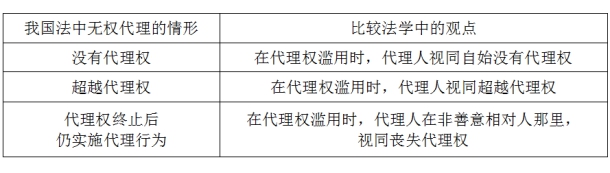 此时需要澄清的问题是原本享有代理权的代理人缘何成为无权代理? 如表格所示,比较法学说中的三种观点,恰好对应我国法中无权代理的三种情形。三种观点的结论均为,代理权滥用导致无权代理,代理行为效力待定。