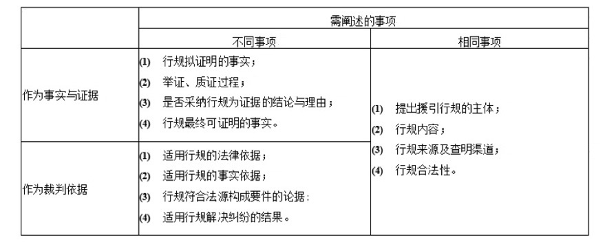 为确保行规适用符合《民法总则》《合同法》及《民事诉讼法》之规定,法官有必要对拟适用的行规进行合法检验和个案审查。同时,若法官最终决定采纳行规为证据或援引其为判决依据,则应在裁判文书中就拟适用的行规内容是什么、为何适用及如何适用等问题进行专门阐释。一方面,在裁判文书中阐明证据采纳结论和采信理由是法官的职责,以行规为证据也不例外。另一方面,在裁判文书中阐明裁判依据和理由亦是法官必须完成的任务,以行规为判决依据时尤需如此。总结而言,商事审判中行规或是作为事实与证据,或是作为裁判依据,两种情况下法官需要阐释的事项既有共同点,也有不同点(参见下表)。