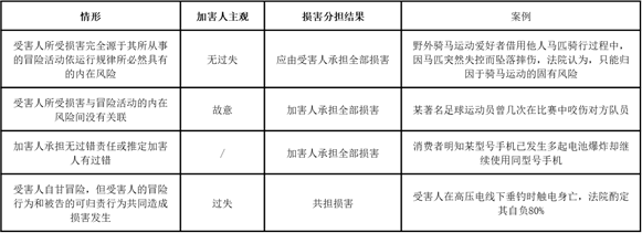 如前所述,对于自甘冒险案件中的损害分担,应对活动开始以后、损害发生之前当事人的行为进行评价,特别是要对其他人的行为进行评价。因此,损害分担结果应视情况而不同,不能因为不同事件中都存在“受害人自甘冒险”这一共同元素,就一概由受害人承担全部损害。从案件裁判结果来看,我国侵权法应采综合适用模式,不应采独立抗辩模式。