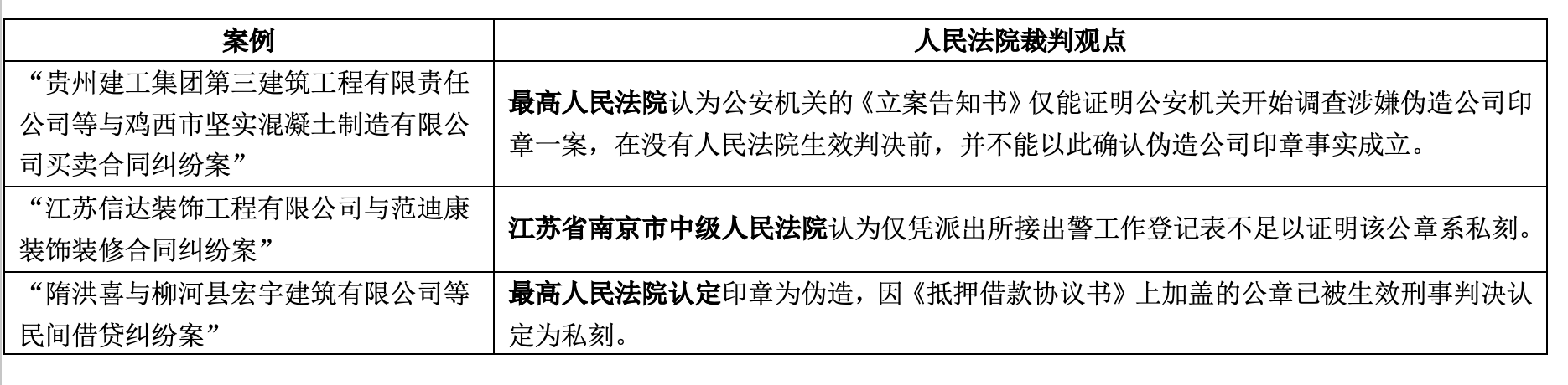 另外,在疑似印章伪造的情形下,当事人往往会向公安机关报案。如果公安机关已经进行立案调查,甚至在询问笔录中行为人已经自认印章伪造,此时一方主张印章伪造,人民法院是否采信这一证据而认定构成印章伪造事实?司法裁判观点认为,除非具备生效判决认定印章伪造,当事人不能仅凭自认或者公安机关刑事立案为由确认印章伪造事实。