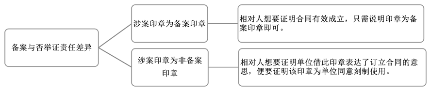 印章备案与否在举证责任分配上有一定差别,因为备案的印章具备公示带来的公信力。无论加盖的是备案印章还是非备案印章,都只是推定单位借此表达了订立合同的意思。若有证据否定合意的真实性,便不能根据印章的真实性直接推定协议的真实性。