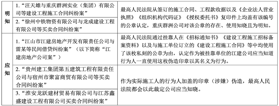 在印章伪造下讨论容忍型表见代理,第一个难题便是相对人有证据证明本人知情。相对人须举证证明本人对行为人使用伪造印章知情,从而通过伪造印章本身的代理性质判断出本人对行为人以自己名义为行为的知情。审判实务中的难点在于如何识别本人的知道或者应当知道。要认定本人明知,需确定本人对伪造印章使用情况知晓;对于应知的认定则只能通过相关事实进行推定,如基于建设工程实际施工关系中的习惯,只要实际施工人伪造了承包人印章,一般都会推定承包人应当知道。