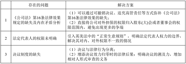综上所述,我国《公司法》第16条是规范公司决议程序和划分公司内部权力的规定,不是判断合同效力的直接依据,不论是对决议程序的规范还是对内部权力的划分,此时都尚未涉及其是否具备外部效力。