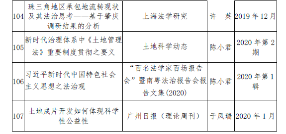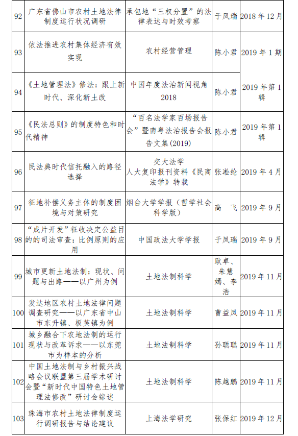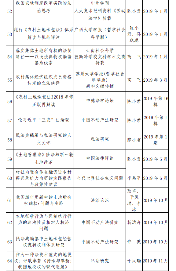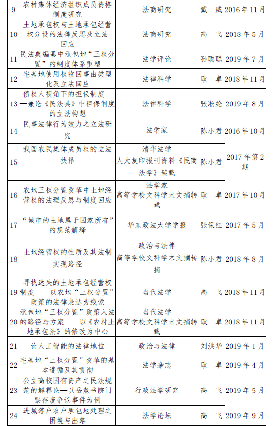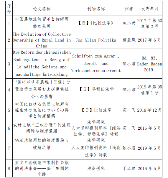 1.学术论文。共发表学术论文107篇,其中,国际高水平期刊5篇,法学核心期刊(CLSCI)21篇,其他CSSCI来源刊物48篇。