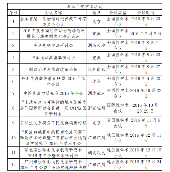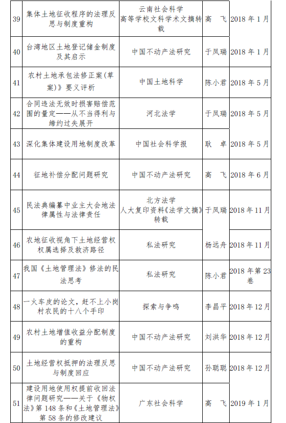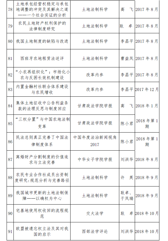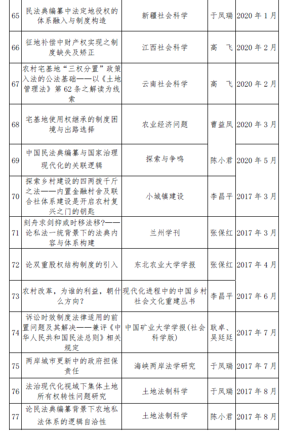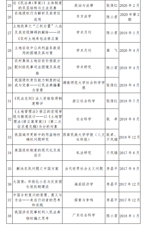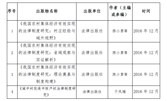 2.出版物。撰写著作17本,其中在法律出版社、中国政法大学出版社、北京大学出版社分别出版著作7本、2本、2本。创设集刊《土地法制科学》(已出版3卷),担任副主编并参编“马工程”教材《民法学》、连续参编国家统一法律职业资格考试教材等。