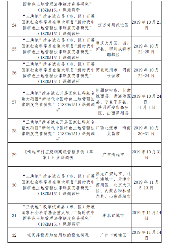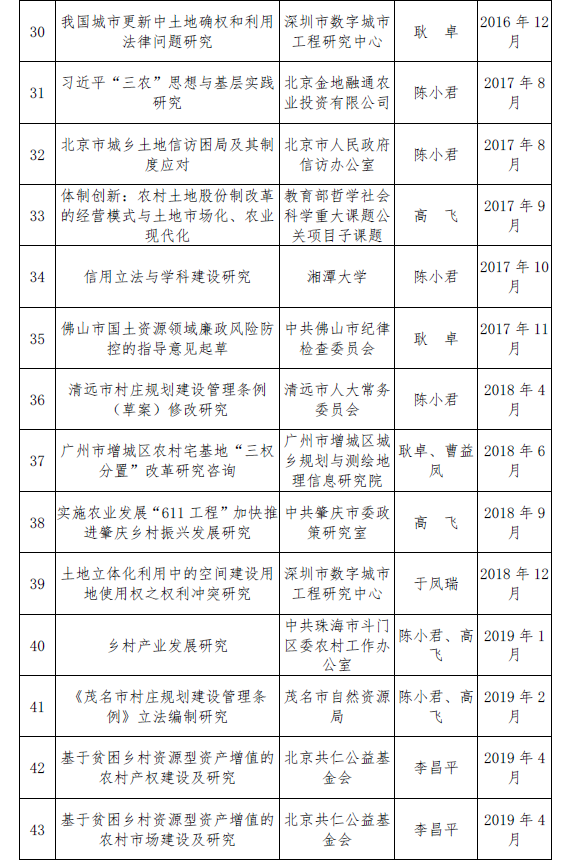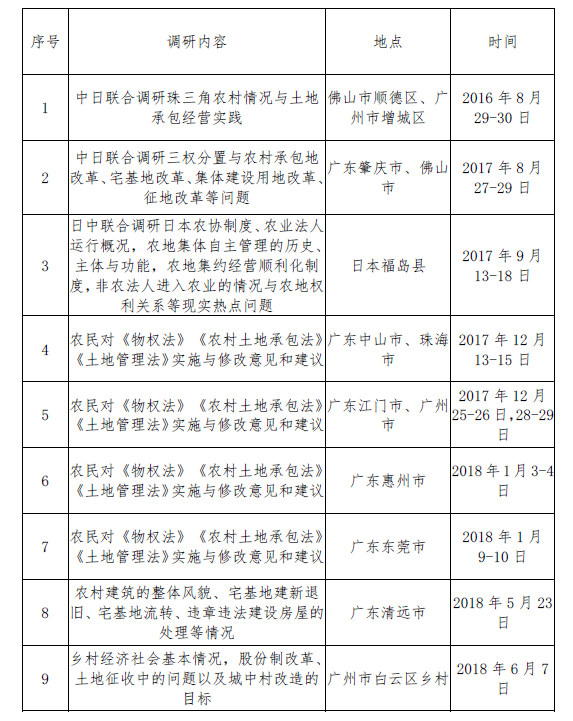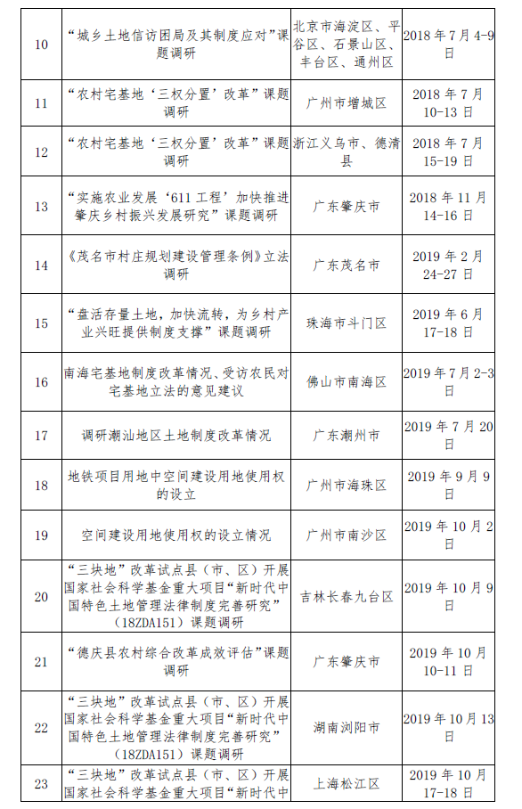 3.坚持调研特色。延续陈小君教授及其团队1999年创建土地法律制度研究机构至今年复一年田野调研传统。近4年高频率完成多次规模调研:例如对全国31个省(市、自治区)33个县(市、区)“三块地”改革试点的全域调研;中日、中德农地法律制度调研;珠三角9地城乡土地制度专题调研,广东21地市中16个地市土地管理制度调研、北京市土地信访问题的特色专题调研等。为参与国家立法和区域法治建设献言献策奠定坚实基础。