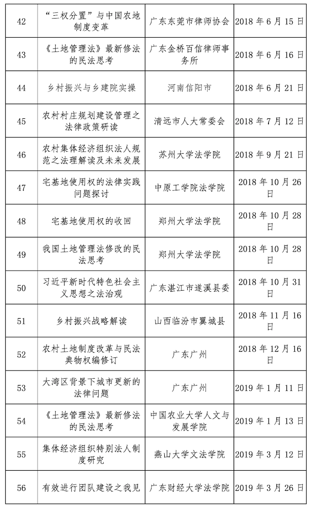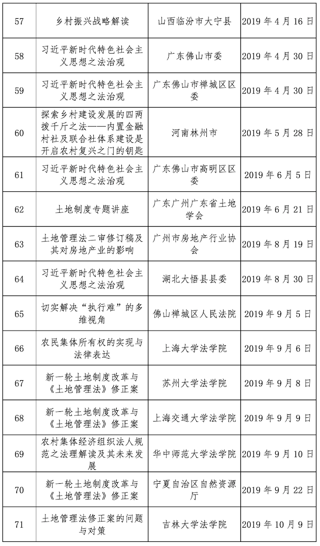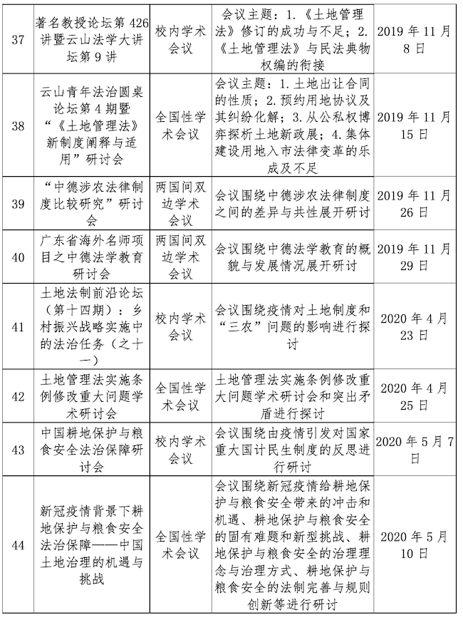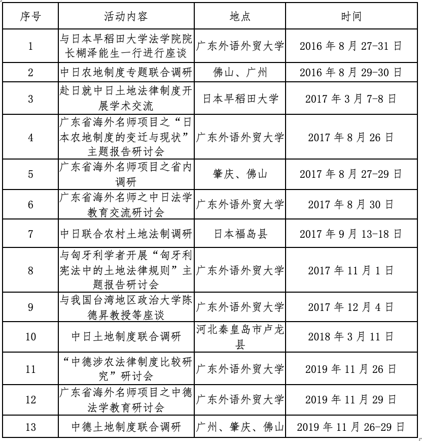 2.境外学术交流。开展国际实质交流与合作十余次,与日本早稻田大学法学院、德国哥廷根大学农业法研究所等国外知名院校和研究机构建立实质合作关系,展示我们在研究领域的道路自信、理论自信、制度自信、文化自信。在广东肇庆、顺德、增城,河北秦皇岛和日本福岛县等地展开了中外合作调研。聘请国外知名教授为特聘研究员。稳步推进与西班牙、匈牙利等欧盟国家相关大学和研究机构实质性学术交流合作,为深入研究土地问题注入了新视角新活力新能量和强动力。