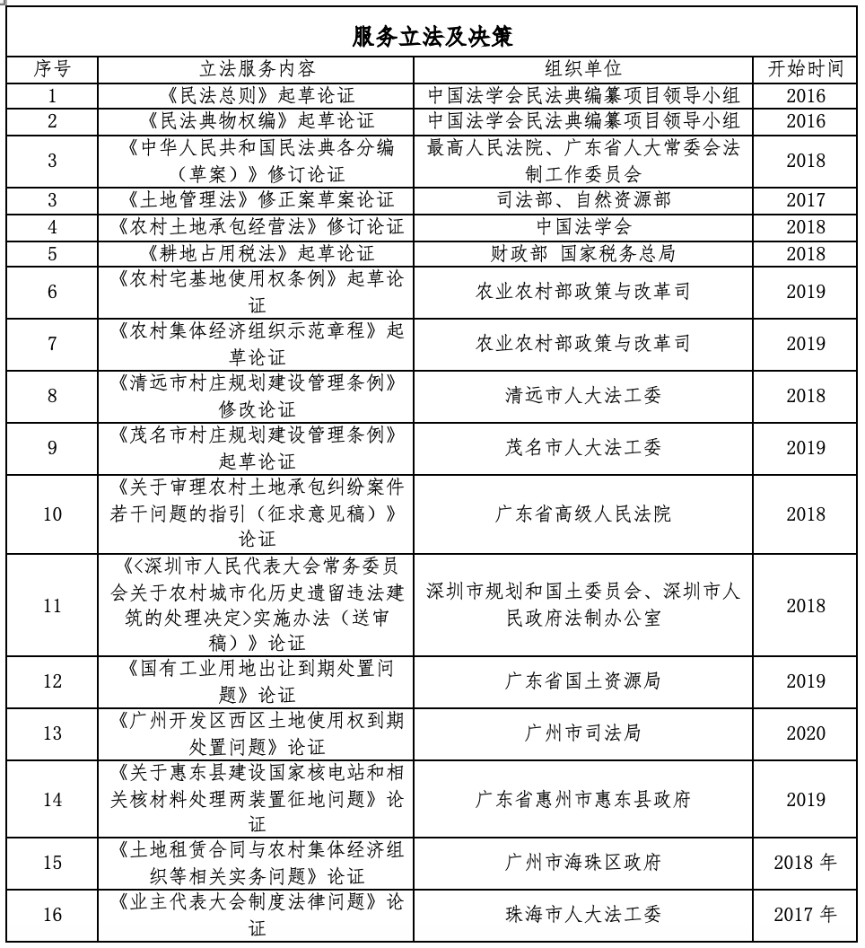直接参与中国民法典之《民法总则》《物权编》编纂,参与《农村土地承包法》和《土地管理法》修正论证;起草《茂名市村庄规划建设管理条例(草案)》等地方立法,参加农业农村部、自然资源部、司法部、中国法学会组织的涉农涉土法制制定与修改咨询论证,为相关制度发展完善竭力贡献智识。陈小君教授于2017年作为唯一京外学者受聘为农业部法律顾问;与北京市政府信访办共同成立“华南研究基地——信访与土地制度研究院”,注重科研成果积极向政府决策转化,服务地方法治等建设。在北京、黑龙江、贵州、湖北等12个省设立了13个乡村振兴战略法制乡建研究工作基站,指导地方政策实施和实践探索,成效明显。多项土地法制研究成果转化为政策实践。在媒体上就土地法制和三农法治问题积极发声,回应当下社会实践的热点、难点和痛点问题。