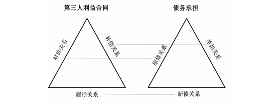 第552条规定第三人和债务人可以不需要债权人同意达成债务承担协议,使债权人直接获得向第三人的请求权,其理论基础在于第三人利益合同。两者的近似关系见下图。