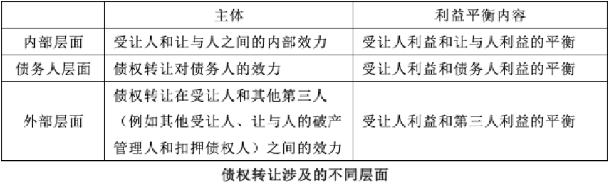 因此,不应该通过转让通知确定债权转让在不同层面中的效力,更佳的方式是将不同层面区分开:内部层面,受让人取得转让债权不以通知债务人作为条件;外部层面,转让通知的先后并非当然是债权利益最终归属的决定性条件,此时,债权转让通知不决定债权转让的时间和债权的最终归属,而仅仅是对债务人发生效力的条件。据此,较之《合同法》第80条第1款,《民法典》第546条第1款删除了“应当通知债务人”,更为清晰地体现了转让通知仅是对债务人发生效力的观点。