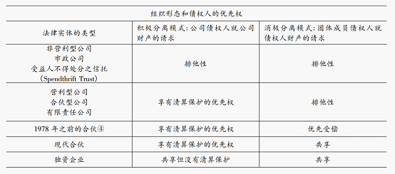 著名的公司法学者汉斯曼(Henry Hansmann)和卡拉克曼(Reinier Kraakman)根据上述两类财产分离模式就各类组织形态的财产分离程度进行归类分析: