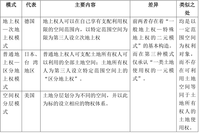 我国现行法仅承认了建设用途的空间使用权。就建设用途的空间使用权制度如何构建,世界各国(地区)立法以及我国《物权法》草拟过程中存在不同的路径选择。