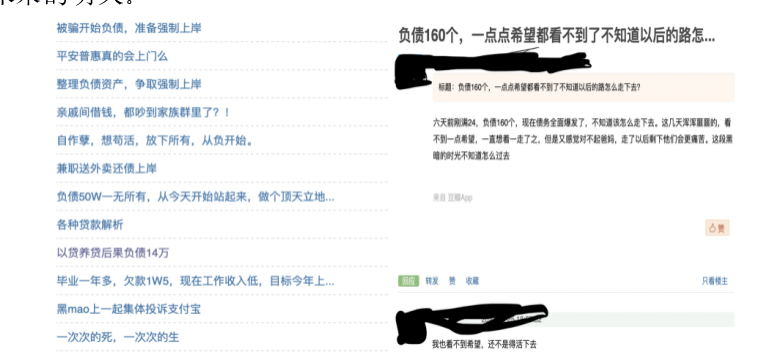 2.逾期。很多网络借贷平台跟个人征信系统关联,因此,网络借贷中的许多借款人因为害怕逾期累计的高额利息以及逾期可能对个人征信状况造成的影响而被迫走上“以贷养贷”、拆东墙补西墙的道路,最终导致债务雪球越滚越大,自己“求助”的网贷平台越来越多,开的信用卡也越来越多,终日深陷于还款的压力下,严重影响个人的工作与生活。