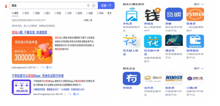门槛低、随借随还、足不出户、手续简便,网贷平台的小广告无处不在。只要输入“借钱”,就可以发现各种各样的网络平台以及app,另外,常见的许多app也提供借贷服务,如支付宝的花呗、借呗,京东的白条,携程的借去花……网络借贷可以说是无处不在。一般而言只要向平台提供个人身份证,完成实名后就可以向这些平台借钱,部分平台额度高达几万、十几万,“轻轻松松”十几分钟,用户就可以借到几万乃至几十万。但是借钱一时爽,还钱却是火葬场。
