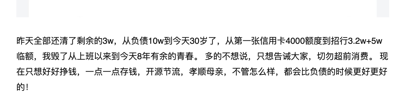 花呗、借呗、金条、白条、分期乐、百度、美团、信用卡……从各种app、信用卡到各大网络借贷平台,打着及时享乐的名义,鼓动年轻人提前透支未来的消费主义陷阱无处不在。消费主义让人们把消费当做人生的最高意义, 激励人们拼命赚钱,及时消费。在消费主义鼓吹之下,很多东西也许不是你真的需要,而是有人让你觉得你需要。正是这种价值观鼓动着年轻人去透支未来,而长期过度超前消费在给人带来一时的快感之后,只独留人们去面对看不到未来的明天。