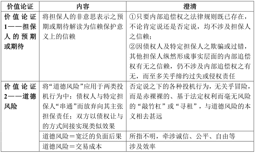 公平与否的判断,更适合交由权威而非理性完成。有研究坦陈,“单纯地依赖公平原则立论,说服力存疑”,但其又认为,若考虑“系列交易、整体安排”,(混合)担保人内部追偿权之否定说“更具说服力”。首先,该研究存在定义误区,公平的定义固可见仁见智,但并非没有边界;其次,该研究存在夹杂于公平论证中的其他非价值判断,尤其是逻辑推演与事实判断的误区。在定义方面,“系列交易、整体安排”并非独立价值,而是特定担保人A与债权人或债务人的利益总和之载体,对应于特定“公平观”。抛开定义不论,即使该公平观成立,鉴于非价值判断的误区,否定说也未必比肯定说更“公平”或更能保障相关主体之利益。