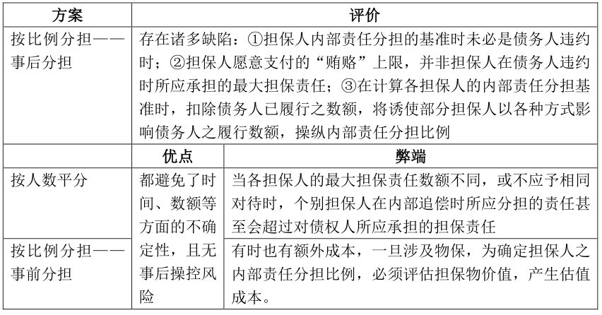 其次,担保人内部追偿权规则属于任意性规定。其“当事人”为担保人,而不包括债权人。任意性规定要义在于契合最大多数当事人的意愿,模拟其最有可能达成的约定。该最大多数无需为绝对多数,而可以是相对多数。担保人内部追偿权之规则设计的关键,在于厘清最大多数担保人的意愿:其更愿意法律肯定还是否定内部追偿权?这首先是事实判断;之后,自由、公平、效率等不同价值判断才有用武之地。
