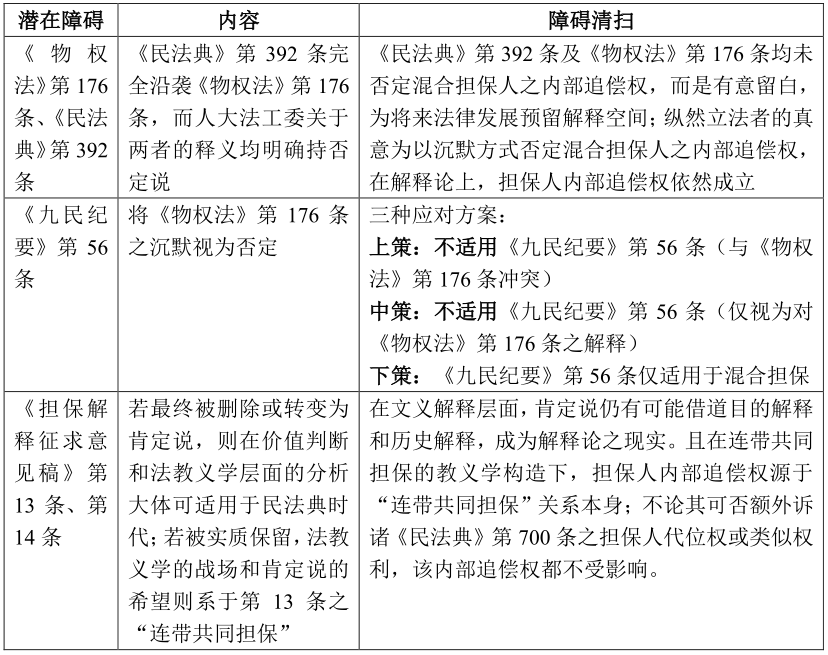 《民法典》第700条的双重追偿权尤其是保证人内部追偿权,可类推适用于其他担保,混合担保亦不例外。以下扫清若干潜在障碍。详见下表。