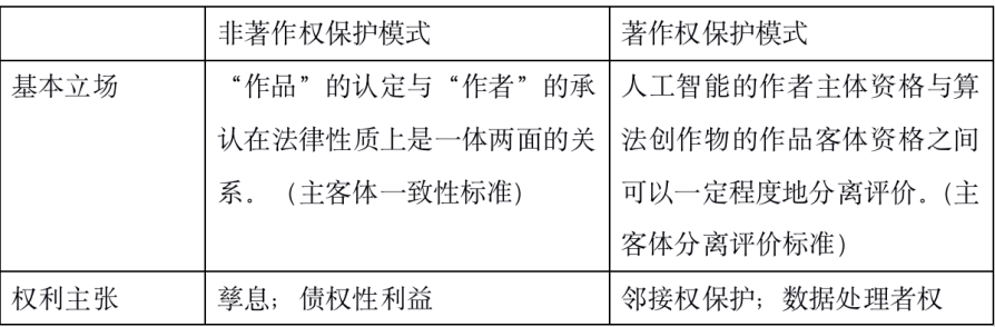人工智能是实现人类利益的工具,不应具备权利主体的资格是人们的共识。但是,进入算法时代后,算法创作物在越来越广泛的作品类型领域具备高度的作品外观,学界在是否赋权这一根本问题上产生了分歧。赞成对算法创作物赋权的观点可概括分为著作权保护模式论与非著作权保护模式论。两者的根本分歧在于:在不承认人工智能作者(主体)资格的前提下,能否相对独立地从算法创作物(客体)的角度考虑权属模式的选择。