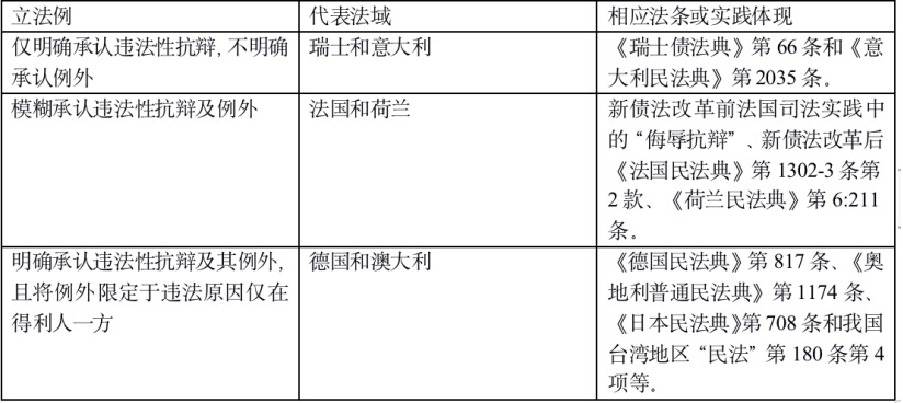 若不对违反强制性规定与违反公序良俗这两个概念作严格区分,针对不当得利返还请求权的违法性抗辩及其例外,大陆法系已形成如下三种立法例。