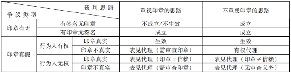 涉及印章的争议较为复杂,但裁判思路无非重视印章和不重视印章两类。关键问题在于,如何将这两种思路落实到法律的解释与适用之中。