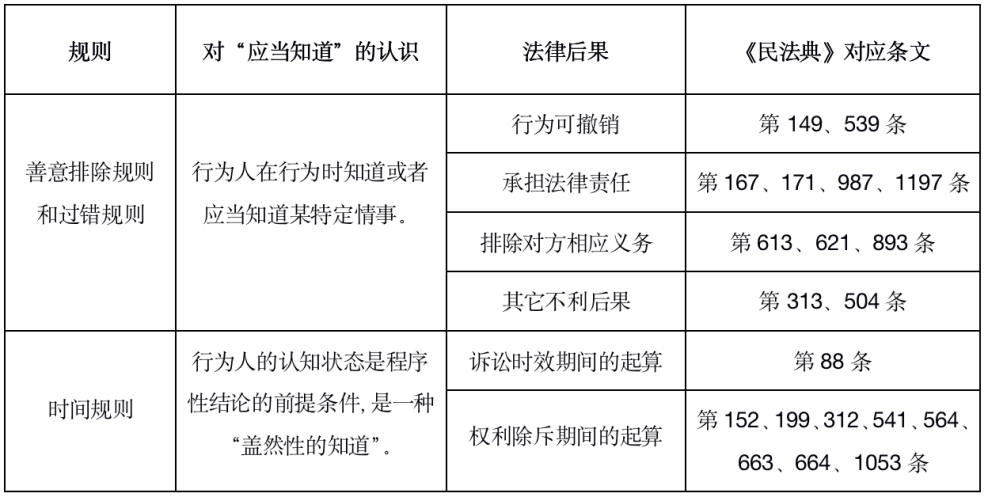风险的实体分配通过权利义务的合理预设来实现,“应当知道”作为实体分配手段主要体现在善意排除规则和过错规则中。法律不应允许某个体因不知道一个众所周知的事实而获利。实务中无法证明行为人确切“知道”时,证明其在具体情形中存在“应当知道”之义务即可。