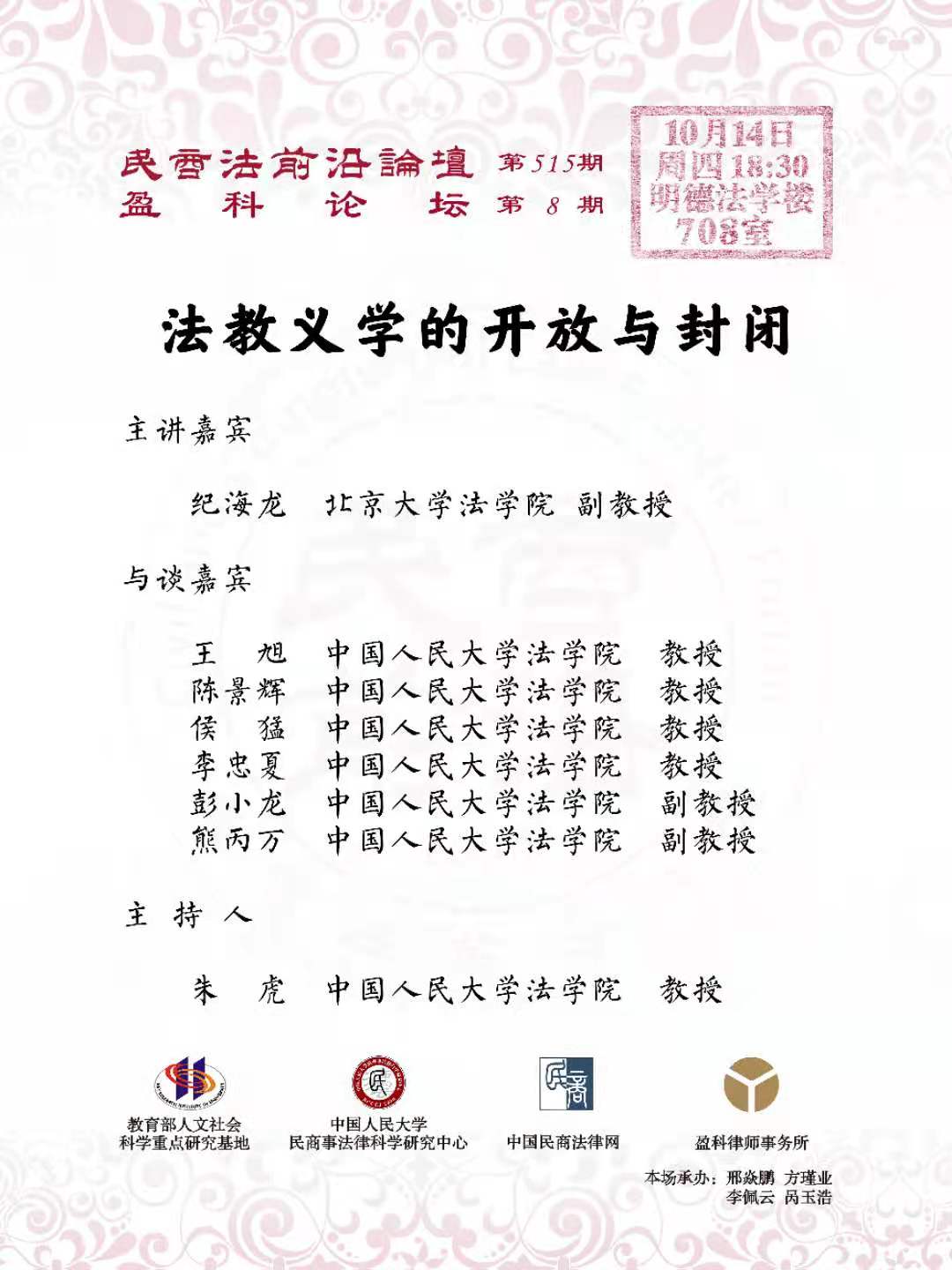 民商法前沿论坛是由王利明教授发起,中国人民大学民商事法律科学研究中心主办的品牌学术活动。民商法前沿论坛以“打造学术争鸣之地、前沿传播平台、学子见贤思齐之所”为宗旨,自2000年9月15日创办至今逾20年,已经成功举办逾514期,现场听众累计超过8万人。论坛实录通过中国民商法律网全文发布,累计阅读量已逾400万人次。