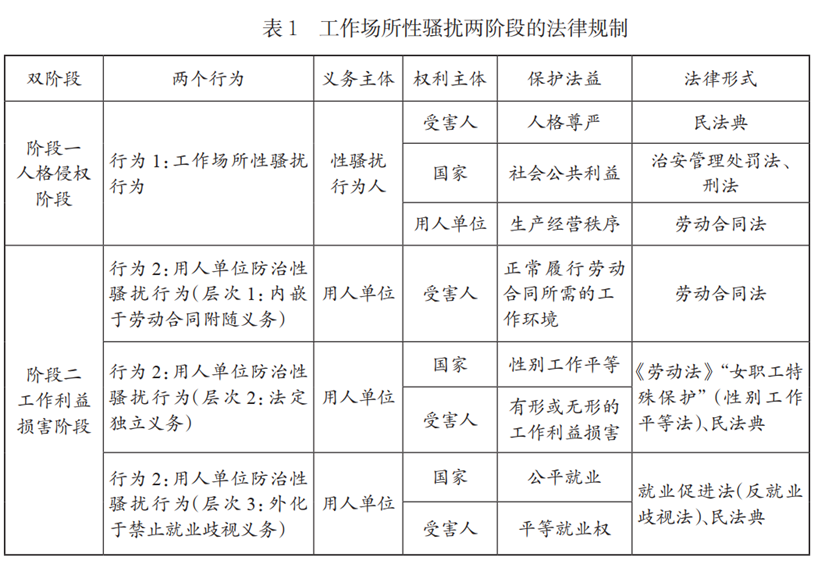 第一个阶段是人格侵权阶段,表现形式为性骚扰行为(行为1)。行为人在此阶段实施了违背他人意愿的性骚扰行为,侵害了被骚扰人的人格利益。此时工作利益实际减损尚未变成现实,敌意环境也尚未真正形成。第二个阶段是工作利益损害阶段,表现形式为用人单位防治性骚扰行为(行为2)。此阶段下用人单位可能基于性骚扰行为而作出有损工作利益的雇佣决定,受害人遭受有形工作利益损害。用人单位亦可能因未履行防治性骚扰的义务,未能及时制止性骚扰行为,而导致无形的工作环境的恶化。因此,利益交换型性骚扰中有形工作利益的减损和敌意环境型性骚扰中无形的敌意环境,都是用人单位的作为或不作为行为造成的,而非第一阶段中的性骚扰行为造成的。性骚扰的双阶段两行为受到多重法律规制,详见下表。