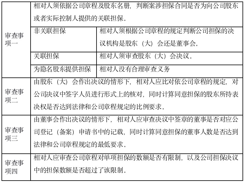由于公司的决议效力应由法院确认,因此关于相对人审查的标准,裁判中总体上趋向于形式审查。所谓形式审查,是指仅审查公司决议的形式要件,对其真实性、合法性、有效性则不作审查。由于形式审查降低了相对人的审查义务,有学者进一步提出相对人不仅应对公司决议进行文义性审查,还应进行简单的逻辑审查。而《民法典担保制度解释》以“合理审查”代替“形式审查”,将审查义务履行程度与一般注意义务标准等同起来,值得赞同。