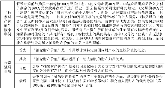 从比较法角度来看,采取净益共同制的德国和瑞士法中同样存在专门用来描述夫妻内部财产关系的概念,如“抽象财产价值”、“财产增加额”等,可借鉴前述概念,将我国“夫妻的共同财产”“夫妻共同所有”理解为夫妻以划分“抽象财产价值”份额的方式分享该条所涉及的各种财产权, 将“夫妻一方的个人财产”解释为夫妻一方独享此类财产权的“抽象财产价值”。