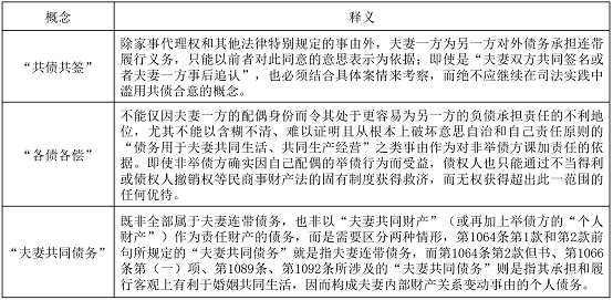 在以“内外有别”思路厘清夫妻内部和外部财产关系后,需回归“共债共签、各债各偿”的民法固有规则和基本理念。