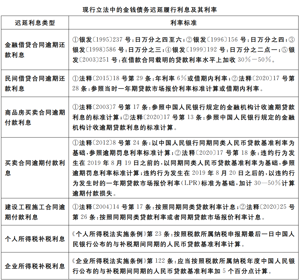 前述关于特定情形中逾期付款利息的规定仅涉及金钱债务的一小部分。除借款合同、买卖合同、建设工程合同等现有立法明确规定迟延付款利息的合同类型外,租赁合同、承揽合同、服务合同等合同类型,以及不当得利、损害赔偿、无因管理等法定之债中均会涉及迟延履行金钱债务的问题。我国现行立法中尚无关于金钱债务迟延履行利息的一般性规定。在既无当事人约定又无法律规定的情况下,必然需要选择以贷款基准利率还是贷款市场报价利率作为逾期付款利息损失的计付标准。该问题主要发生在以下两种情况:第一,没有合同约定及法律规定时,有权收取款项一方要求对方支付迟延履行利息。实务中,租赁合同中逾期缴纳租金、承揽合同中逾期支付报酬、合同解除后逾期返还款项、侵权损害中逾期支付赔偿、无因管理中逾期偿还必要费用、不当得利中逾期返还得利款项等约定或法定之债情形,均会发生迟延履行利息利率选择问题。第二,合同约定了逾期付款违约金,法院参照一定利率的贷款利息对违约金进行调整。