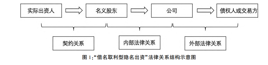 其次,在“借名经营型隐名出资”中,出资义务的履行人与股东权利的实际行使人均系同一人,而将本来“置身事外”的身份关系转化为其与公司之间的直接联系。该类型的法律关系图如图所示: