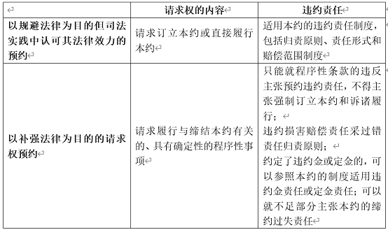 第一,以规避法律为目的的预约。此类预约所规避的具体规定本身需属不当,为了避免预约的规避功能被滥用,对此种预约的认定必须经由审判权的特别监督程序机制作出。以规避法律为目的的预约属于请求权预约。