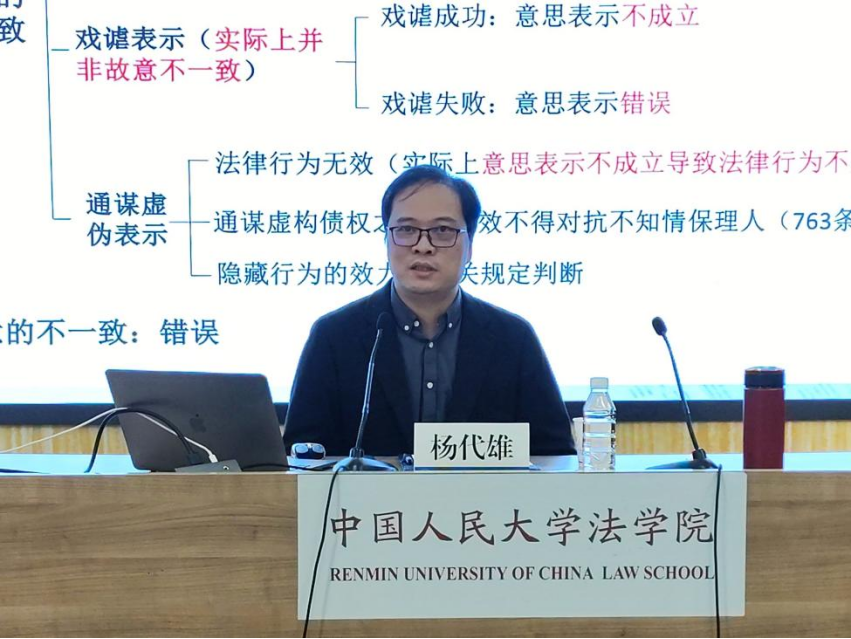 杨代雄老师以“意思表示和法律行为的关系”为主题,从意思表示与法律行为在概念与效力上的关系、因意思表示导致的法律行为效力障碍等方面展开讨论,详细分析了意思表示的生效、组织体内与组织体外的法律行为分类、意思表示的主客观构成要件、意思与表示不一致、法律行为效力障碍分类、欠缺行为能力人实施的法律行为之效力等问题,并以决议和合伙作为典型情形进行分析。