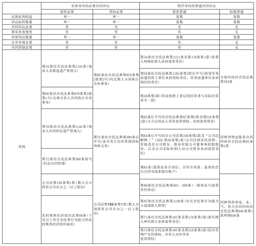 综上,《民诉法解释》及相关规范上的共同诉讼类型及其特征可列表如下: