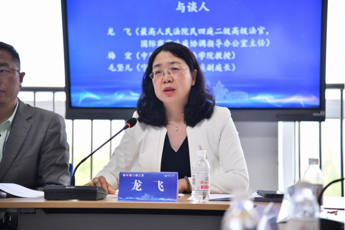 接下来,三位与谈人发表观点,提出要促进理论与实践的深度融合。最高人民法院民四庭二级高级法官龙飞指出,国际商事法庭建设需处理好三对关系:首先,制度创新与理论支撑:鼓励学术界深化对国际商事规则的研究,为“一站式”纠纷解决、外国法查明等创新机制提供理论依据;其次,问题导向与解决方案:聚焦“送达难”“调查难”等痛点,探索域外法查明平台共享、法官国际化培训等路径;最后,国际传播与本土实践:依托最高人民法院官网、微信公众号等平台,加强国际商事法庭成果宣介,推动中国法治故事全球化传播。她建议,应当加强对于国际商事审判的理论研究,促进国际商事审判本土化和国际化相结合。