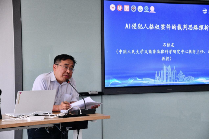 中国人民大学民商事法律科学研究中心执行主任、法学院教授石佳友,围绕AI侵犯人格权案件的裁判思路,剖析AI侵犯人格权的几大情形,尤其是深层次人工智能侵犯精神性人格权方面,进一步探讨了责任承担、AI合成声音产品、AI换脸应用、侵犯肖像权和侵害个人信息权益的竞合等问题。
