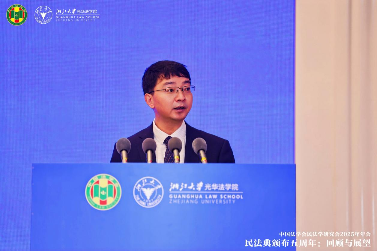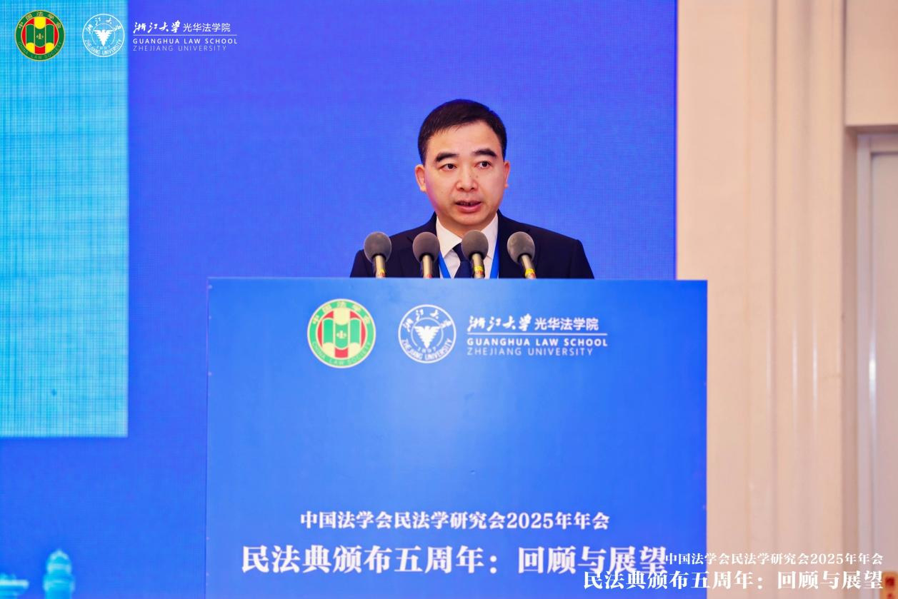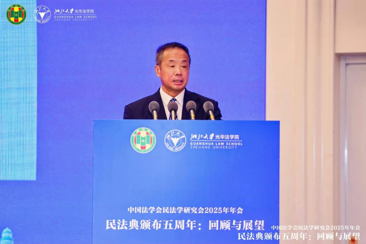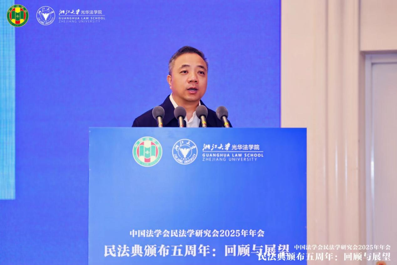 中国法学会民法学研究会常务理事、浙江大学党委常委、副校长周江洪代表浙江大学对各位专家学者的到来表示热烈欢迎。他表示,本次年会围绕“民法典颁布五周年:回顾与展望”,聚焦贯彻落实全面深化改革和法治建设的新目标,展现了民法学界服务国家战略的责任。浙江作为改革开放和法治建设的前沿,为民法典实践探索出可复制的经验。浙江大学法学学科建设成效显著,民商法团队深度参与民法典编纂和普法工作,推出了多项标志性成果。面向未来,浙江大学将以本次年会为契机,深化与国内外法学界交流合作,推动学科融合创新,为民法典高质量实施和中国特色社会主义法治体系建设贡献力量。