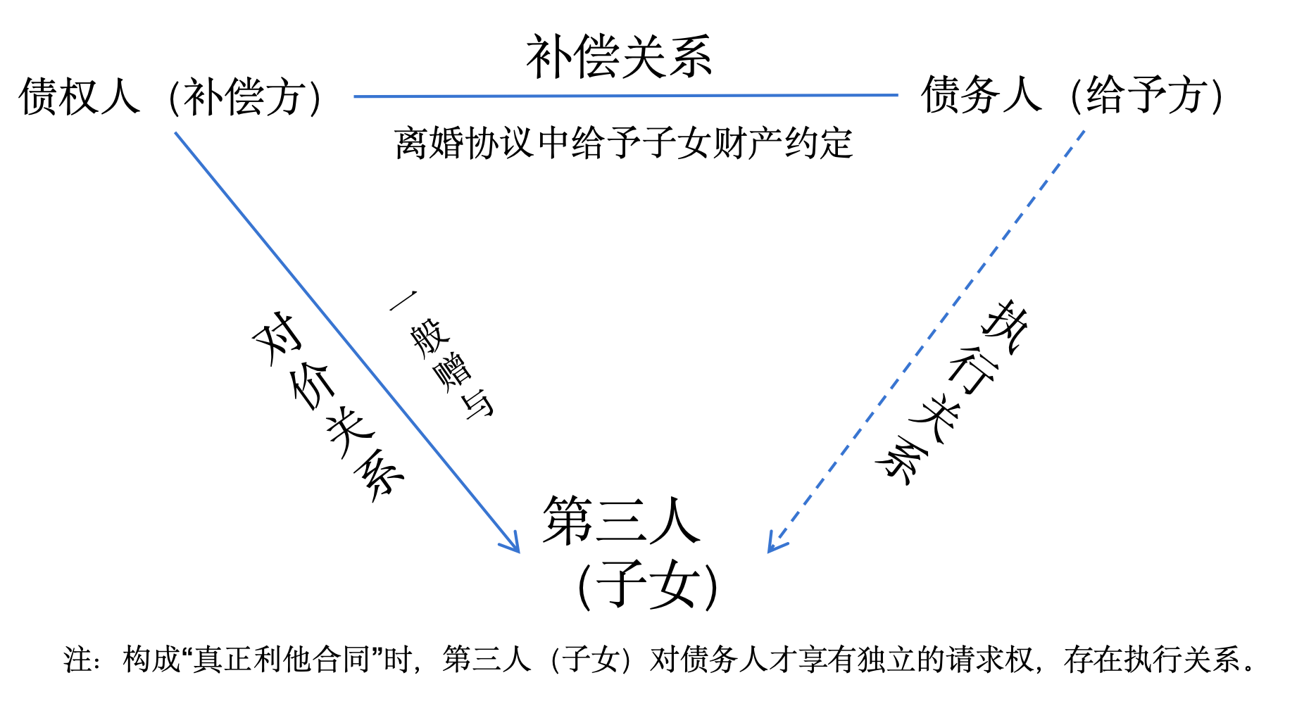第二,在利他合同视角下,给予子女财产约定的对价关系应属一般赠与。在父母一方依据补偿关系负有财产给予义务时,另一方和子女之间成立赠与合同;在父母双方均依据补偿关系负有财产给予义务时,父母双方各自与子女成立赠与合同。实践中,子女难以依据赠与合同获得救济,故应当在补偿关系和执行关系中强化子女的法律地位。