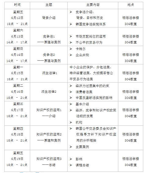 本课程将以系列讲座的形式连续进行。自2015年6月12日(周五)至6月19日举办八次,每次三个小时。主要讲授韩国竞争法,并在此基础上中国法律进行比较分析。