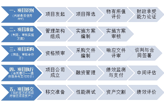 PPP项目的操作流程包括项目识别、项目准备、项目采购、项目执行、项目移交五个阶段,PPP项目所涉的全套法律文件亦分别体现在这五个阶段之内。PPP项目的全部操作流程及相关法律文件的概貌,详见如下图表: