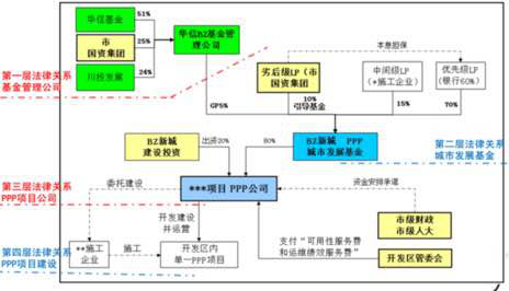 此图看起来复杂,实际是华信投资集团和建筑公司联合参与BZ市开发区PPP项目建设。为了隔离风险、合理避税,各方协商确立了多层次的交易架构。第一层:华信投资集团以下属的华信基金出面,与BZ市国资集团、当地的一家社会企业川投发展公司成立基金管理公司;第二层:该基金管理公司发起成立BZ新城城市发展基金,该基金由市国资集团作为劣后级LP,对中间级LP建筑公司、优先级LP银行担保本息;第三层:该发展基金和政府平台公司BZ新城投资公司合资成立PPP项目公司,市政府、开发区管委会负责资金支持、支付有关费用;第四层:项目公司进行项目建设运营。