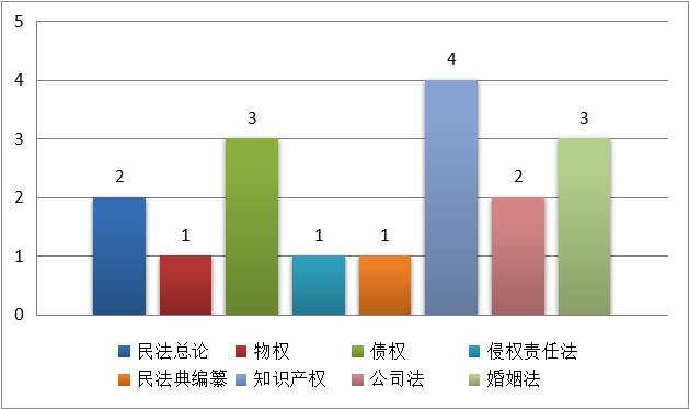 涉及债权的3篇论文中关照了民间借贷司法解释这一热点问题以及从交叉学科、比较法等角度对合同法进行研究;涉及知识产权的4篇论文则主要关注著作权的侵权主体、保护、规制等问题;2篇公司法论文分别讨论了上市公司危机规制和上市公司控制权;3篇婚姻法论文均来自《西南政法大学学报》,涉及亲属权、登记离婚制度等。具体涉及的问题还有表见代理、国家所有权、监护责任、医疗机构侵权责任等。民法典编纂这一热点也在论文中有所体现,多篇论文均在民法典编纂视域下讨论。