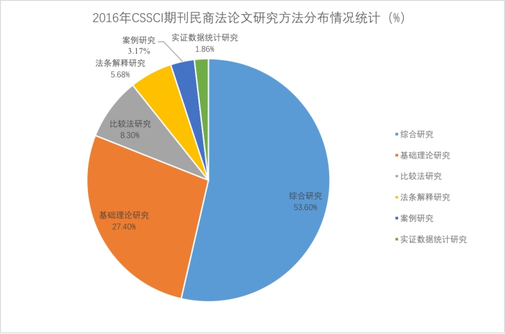 2016年在141种CSSCI来源期刊发表民商事法律科学论文共计916篇中,基础理论研究方法约占27.40%,各种研究方法的综合运用约占53.60%,对域外法的比较研究约占8.30%,法条解释研究法约占5.68%,案例研究法和实证数据统计研究法分别占全部论文的3.17%和1.86%。