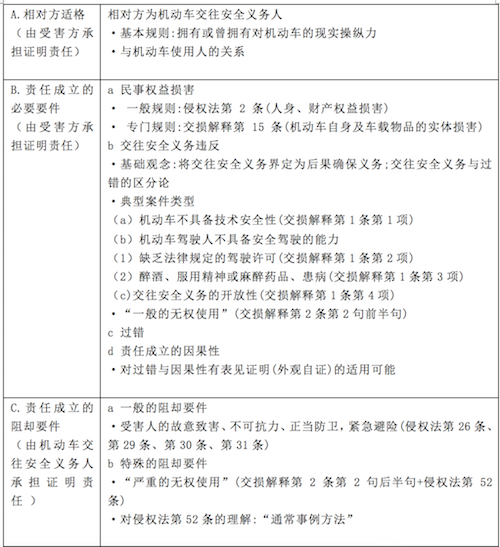 在我国法上,因违反机动车交往安全义务而生的交通事故侵权责任的请求权基础为侵权法第49条第2句后半句和交损解释第1条,责任前提包括:相对方适格;责任成立的必要要件全部满足;没有出现责任成立的阻却要件。现通过图表将要点做出总结。